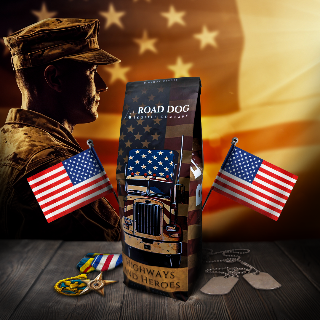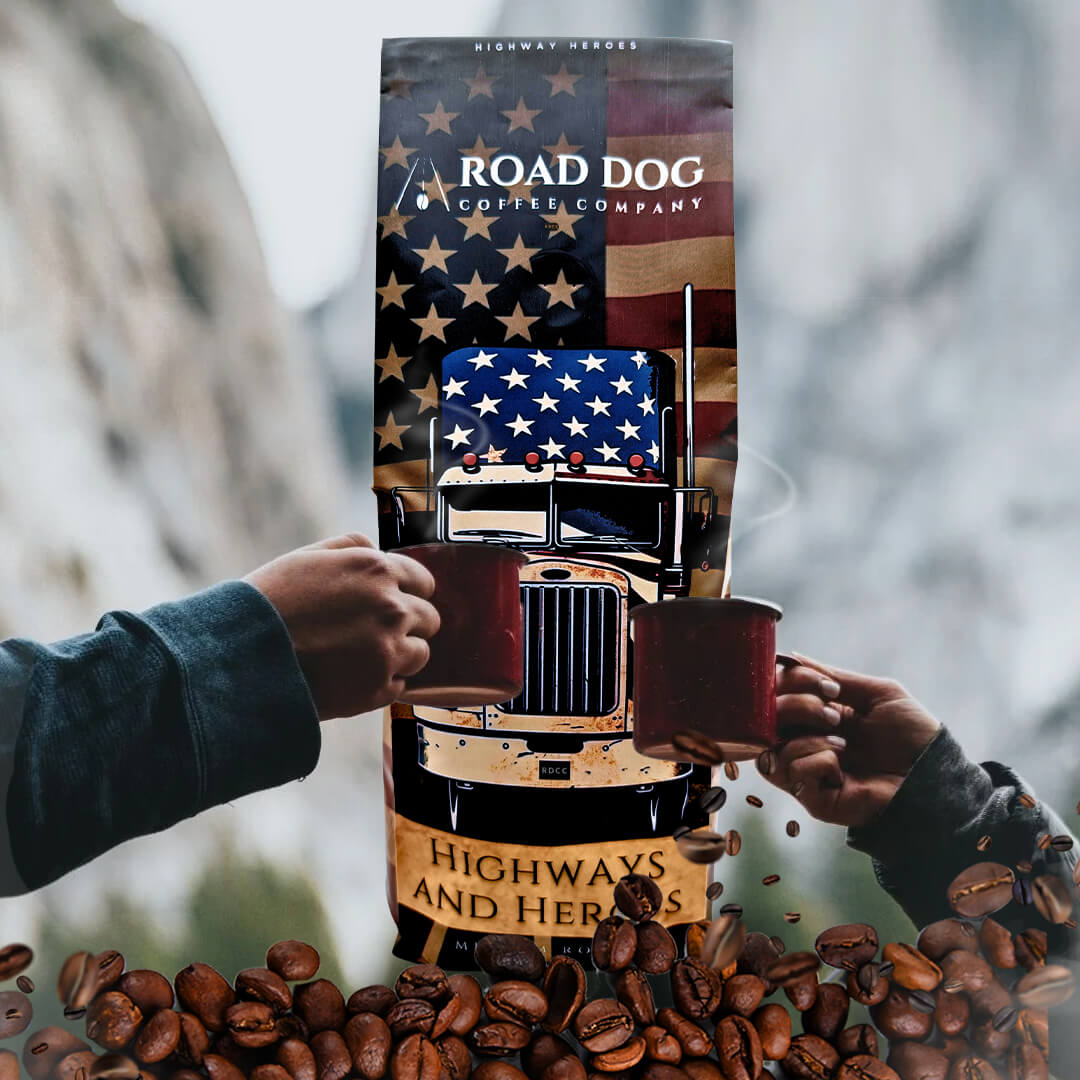 A large piece of Road Dog Coffee Company's success, is from the dedicated hardworking men and women, that serve the highways, work in warehouses preparing shipments and loading trucks, the operations center that book loads, keeping our drivers loaded and rolling. Together, keeping America Delivered. That's why we're committed to delivering high-quality coffee for everyday Americans: patriotic blends that are road warrior approved.